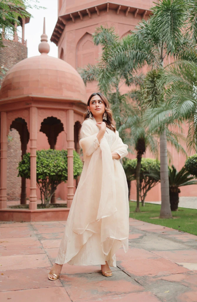 Featuring a embroidered kurti with organza dupatta and pants, Hand embroidery with pearls and sequins.
