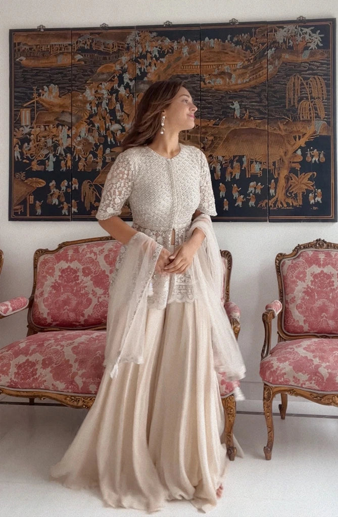 Featuring a short jacket with dori and sequence work paired with a sharara set.