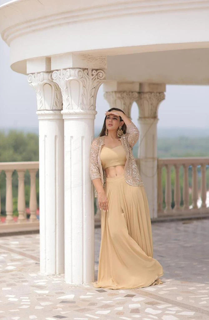 Featuring our embroidered jacket, meticulously adorned with exquisite embellishments, A delicate border of shimmering beads frames this masterpiece, with a resplendent jacket, a kurti, and a pair of bell-bottoms pants.