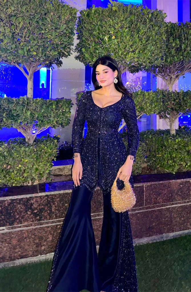 Featuring a short jacket with dori and sequence work paired with a sharara set.